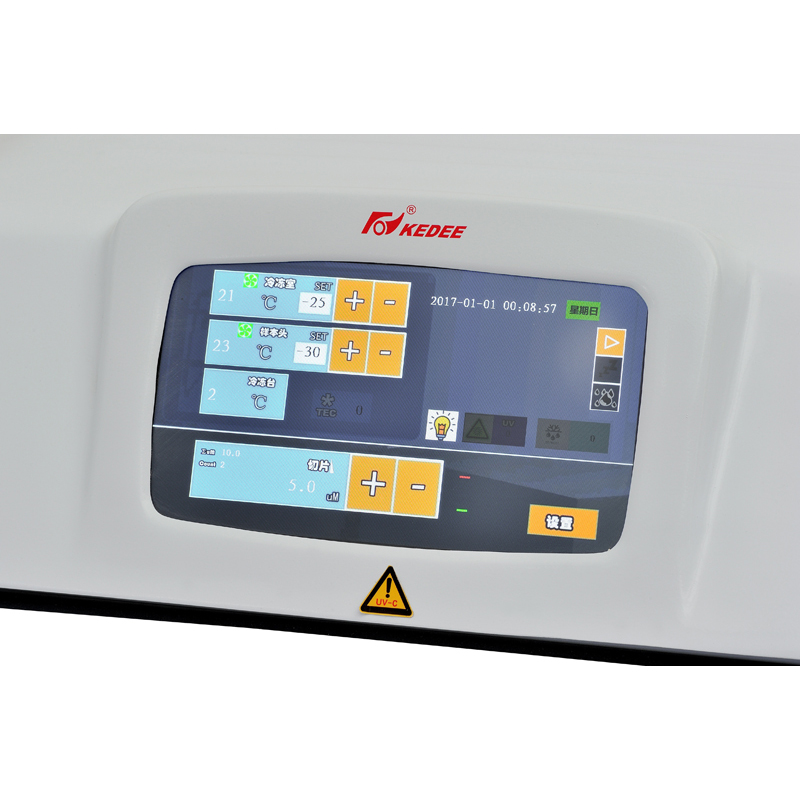 ◇ 配備10英寸彩色液晶觸摸顯示屏,智能人機(jī)交互界面,操作易懂便捷、簡單,實(shí)時(shí)同屏清晰顯示所有參數(shù)(切片總數(shù)量、切片總厚度、切片厚度、標(biāo)本回縮值、溫度控制狀態(tài)、設(shè)備運(yùn)行狀態(tài)、時(shí)間、溫度、定時(shí)休眠開關(guān)機(jī)、除霜等)
