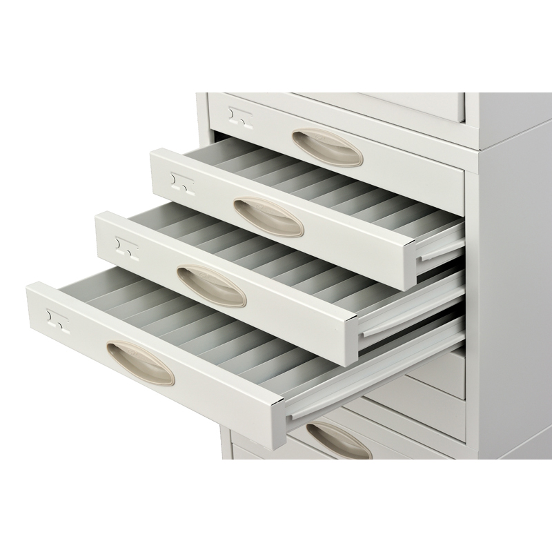 底座采用寶鋼SPCC1.2冷軋鋼板,箱體0.8冷軋鋼板,抽屜0.8冷軋鋼板,每組3節(jié),加底座一只,每節(jié)六個(gè)大抽,中間有活動(dòng)分隔條可靈活歸類,可存放包埋盒蠟塊11000塊左右。